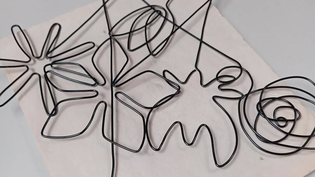 Wir biegen Blumen und eine Figur aus Draht nach Vorlage. Auf Wunsch auch nach eigener Zeichnung. Anschließend wird die Skulptur in einem Holzstück befestigt.