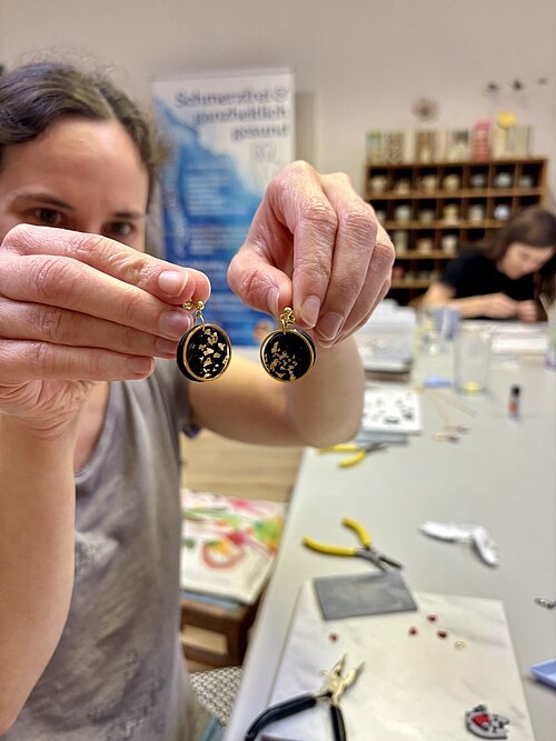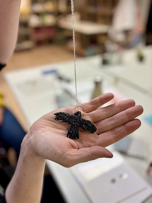 Ablauf: Einführung, Modellierung, im Ofen aushärten lassen, ggf. schleifen, lackieren und - bei Schmuck - zusammensetzen.